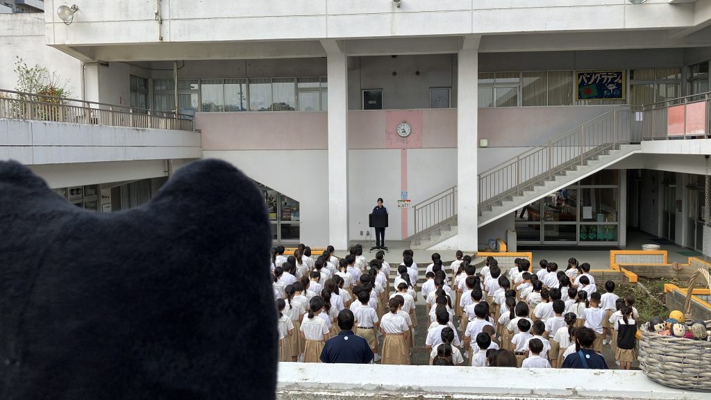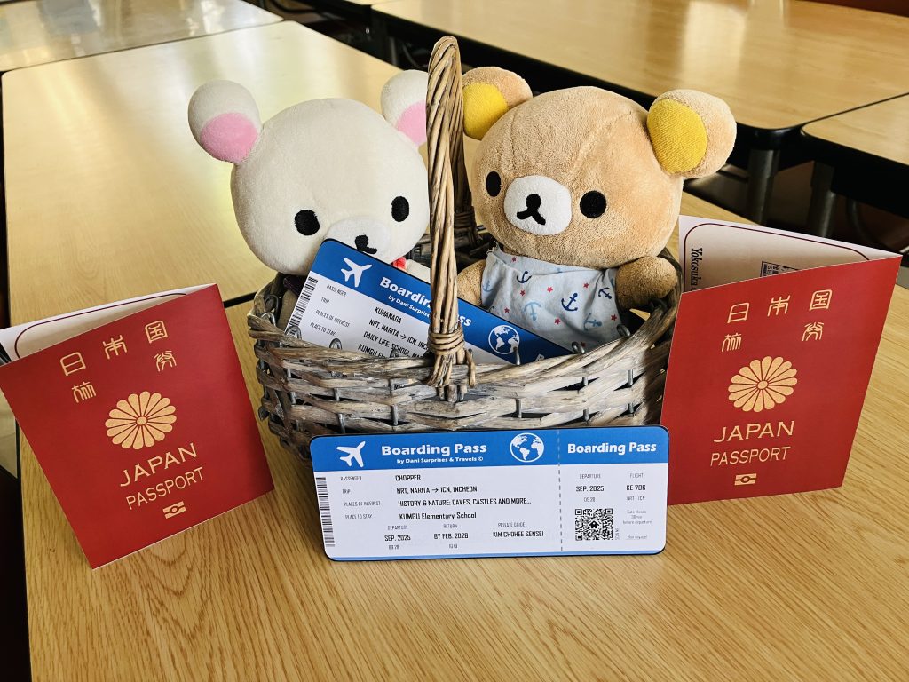 - 6年生は忠清北道 금구초등학교 と交流開始、スロベニアから帰国した「チョッパー」と「くまなが」が出発しました。韓国からはピンクのケアベア「ソウリ」と紫の「ジンチョニ」が来校し、修学旅行や文化祭にも一緒に参加しました。