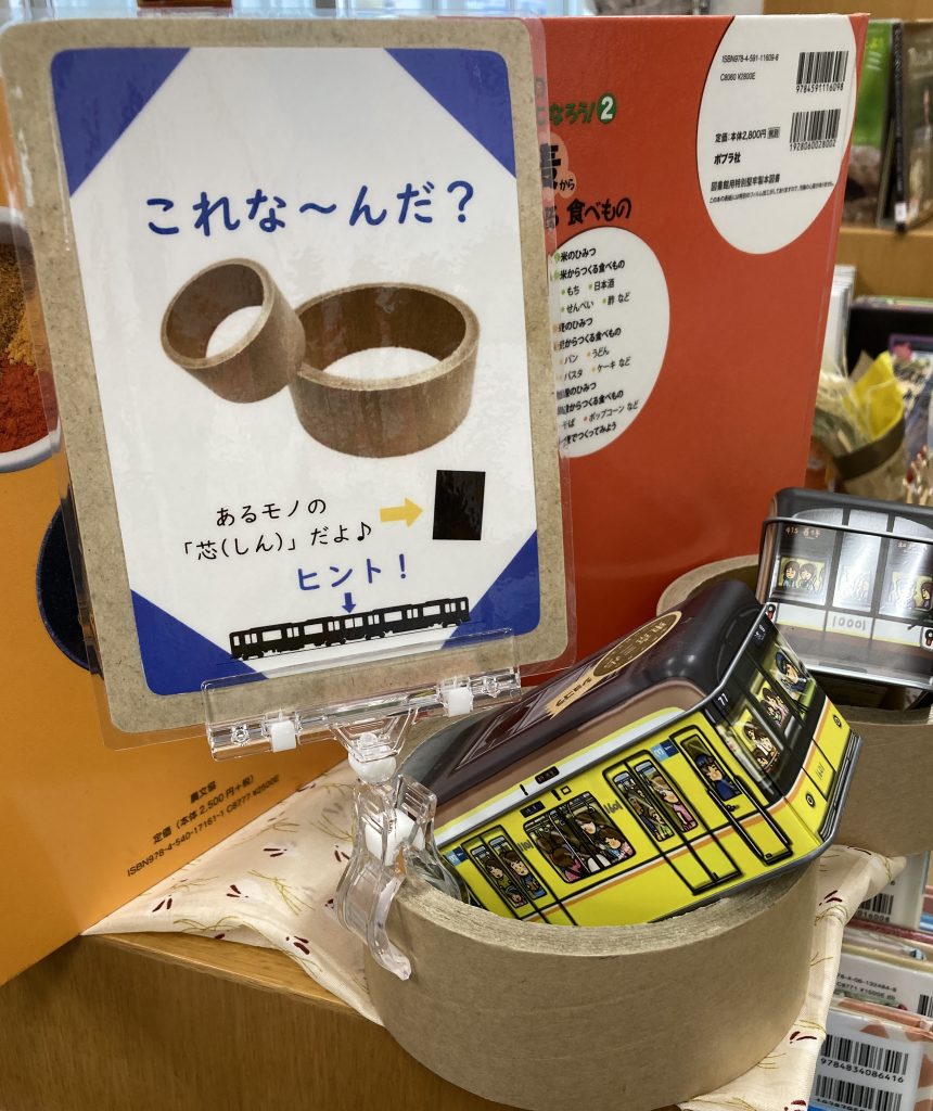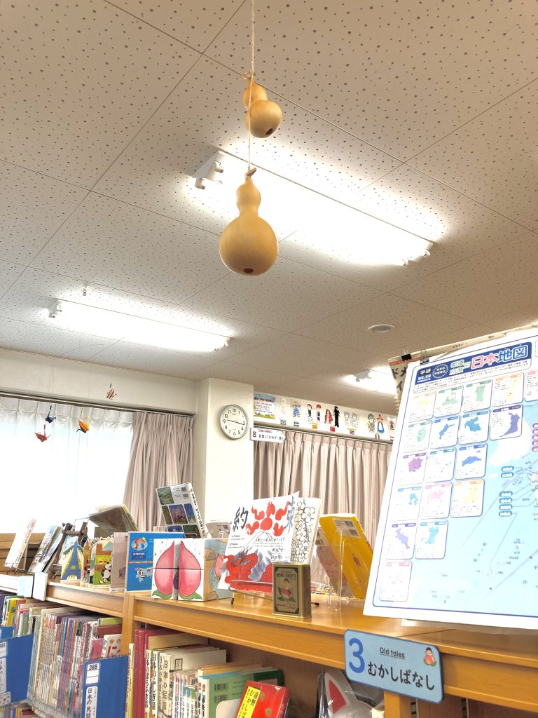特に絵本では、俵の絵がよく描かれています。子どもたちに少しでも昔の世界を感じてもらえたらと、本物そっくりの大きな俵…は難しいので、小さな俵を展示に添えました。さらに「昔話あるある」の瓢箪も吊るしてみましたよ♪
