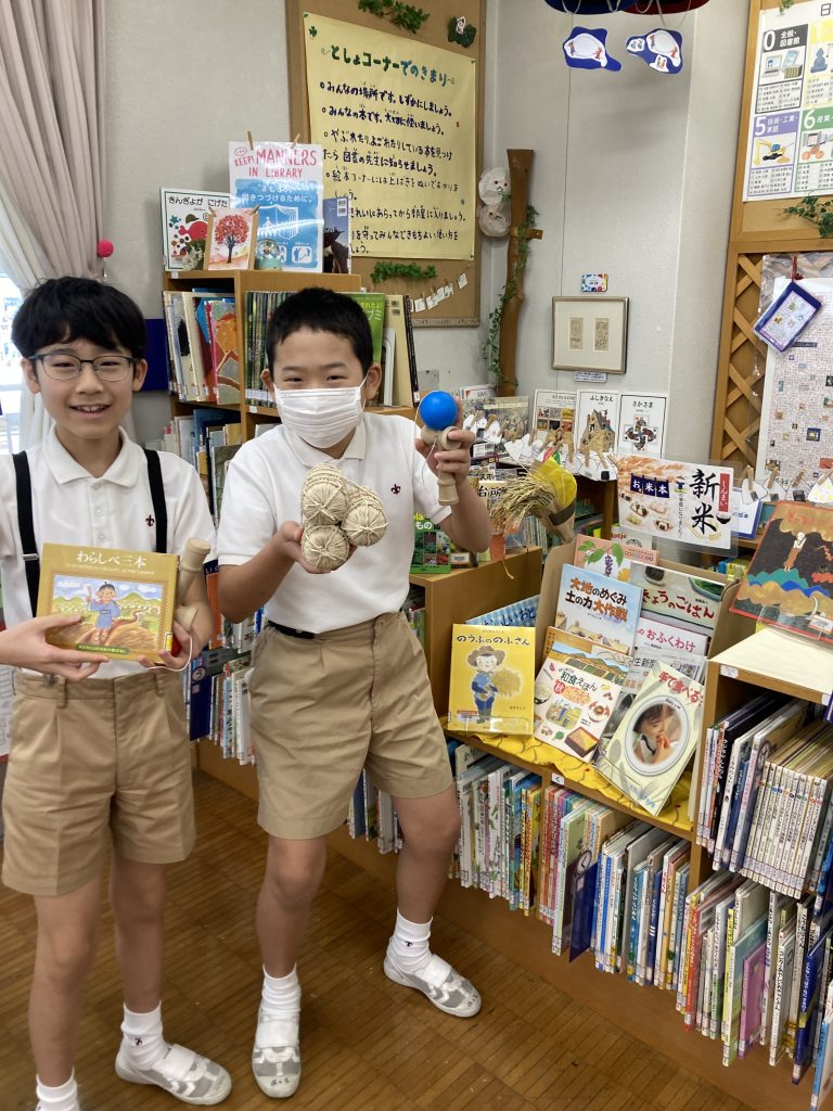 展示には、昔話の絵本から、5年生の社会科「米作り」につながる本まで幅広くそろえています。