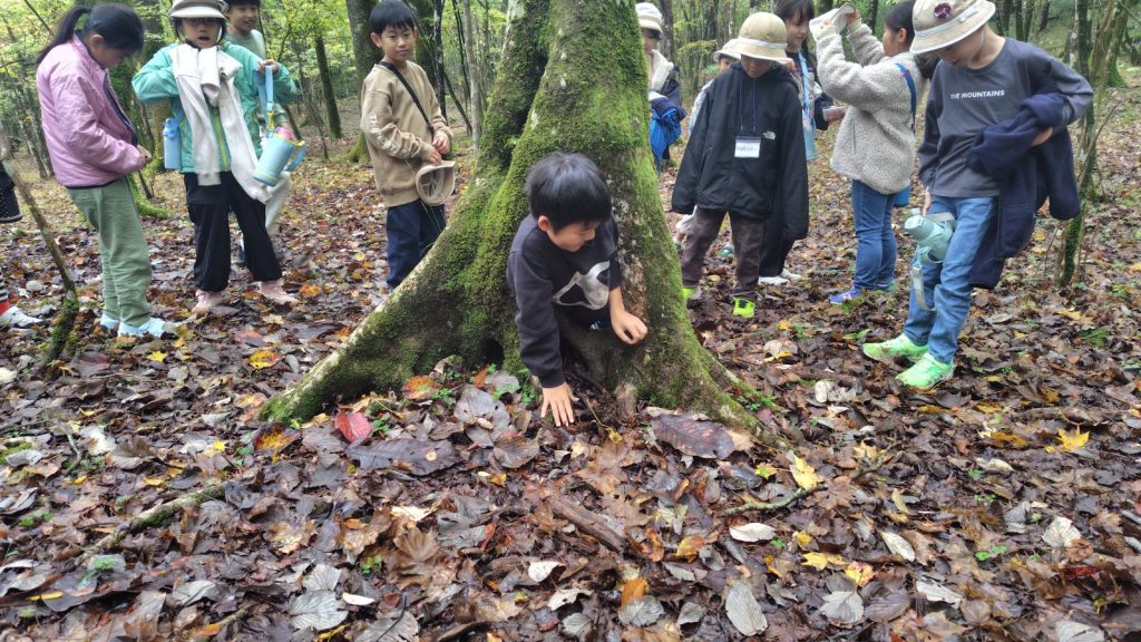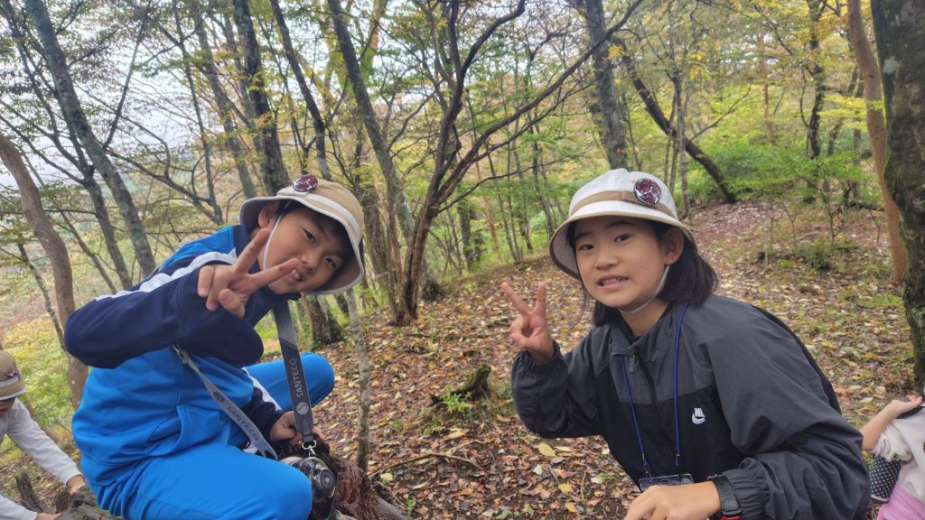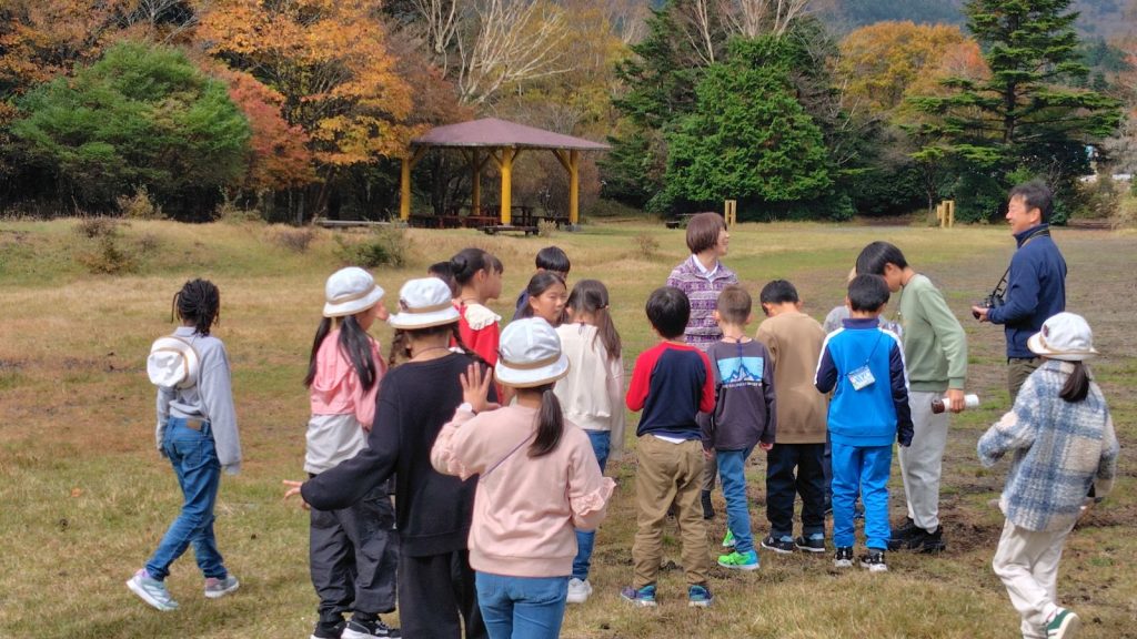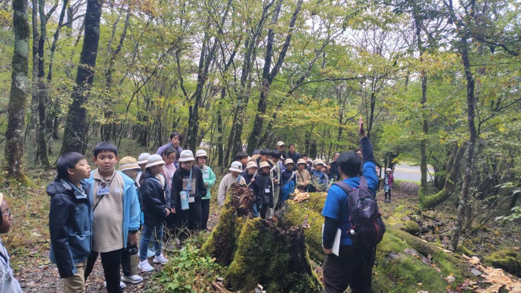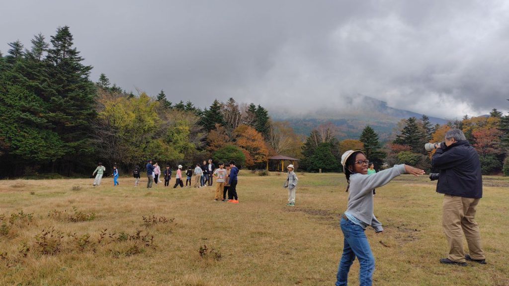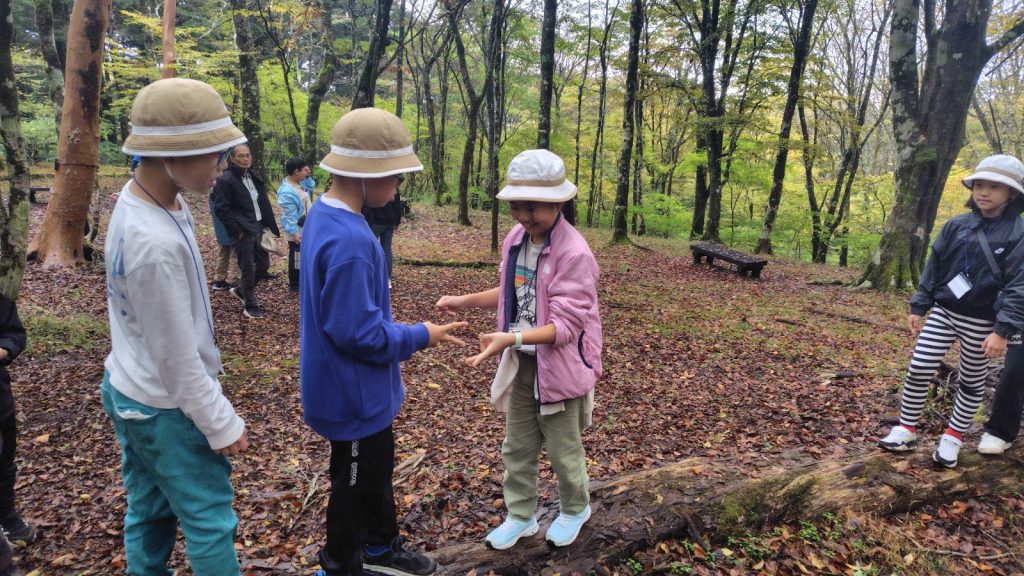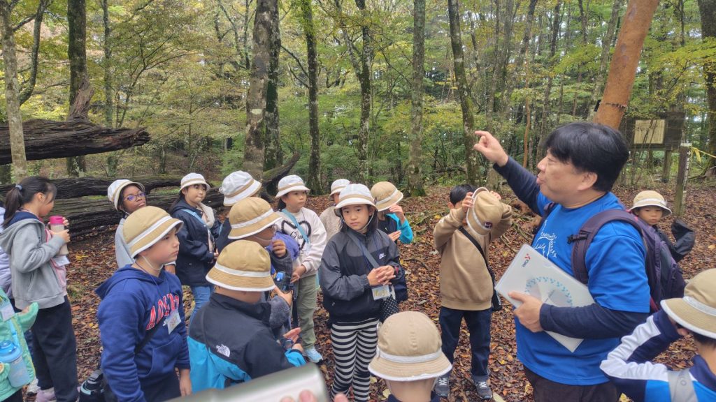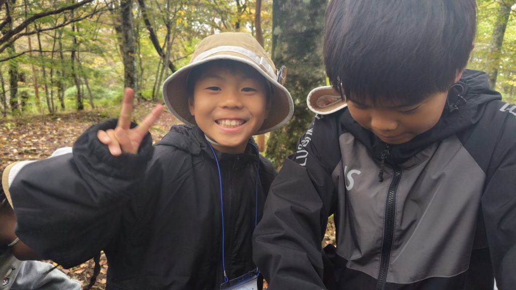 朝の対面式では少し緊張した様子の子どもたちも、自己紹介やゲームを通してだんだんと笑顔に。バスの中では歌をうたい、お昼のお弁当も一緒に食べて、いよいよ富士山麓へ。