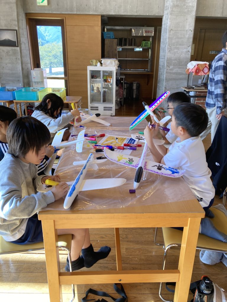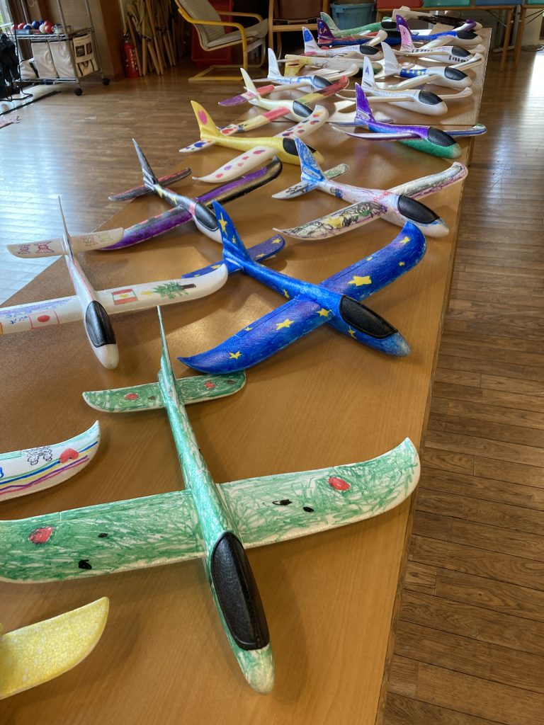 そしてかわいい画伯達は次の「ジャンボ飛行機作り」でも力を発揮します!1人も間違えたり、壊してしまうこともなく難なく作り上げ、色をつけていきます。まぁ、その絵入れ・色付けの素晴らしいこと‼︎皆に。その時の様子を見てもらいたい!と思うほど、集中していました。こうして完成したジャンボ飛行機!子ども達の思いと笑顔を乗せて空高く飛び交う!そんな素晴らしい時を過ごすことができました。