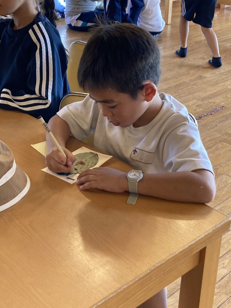 そして午後は楽しみにしていた「葉っぱの葉がき作り」です。自分達で見つけた色とりどりの葉っぱで、世界でたった一枚しかない葉書を作ります。これが、またビックリ‼︎一人ひとり個展が開けるのでは?と思えるほどのでき栄えで…こんな葉書が届いたら、ご家族の方々は、どんなにか嬉しいことか…と思い感動してしまいました。