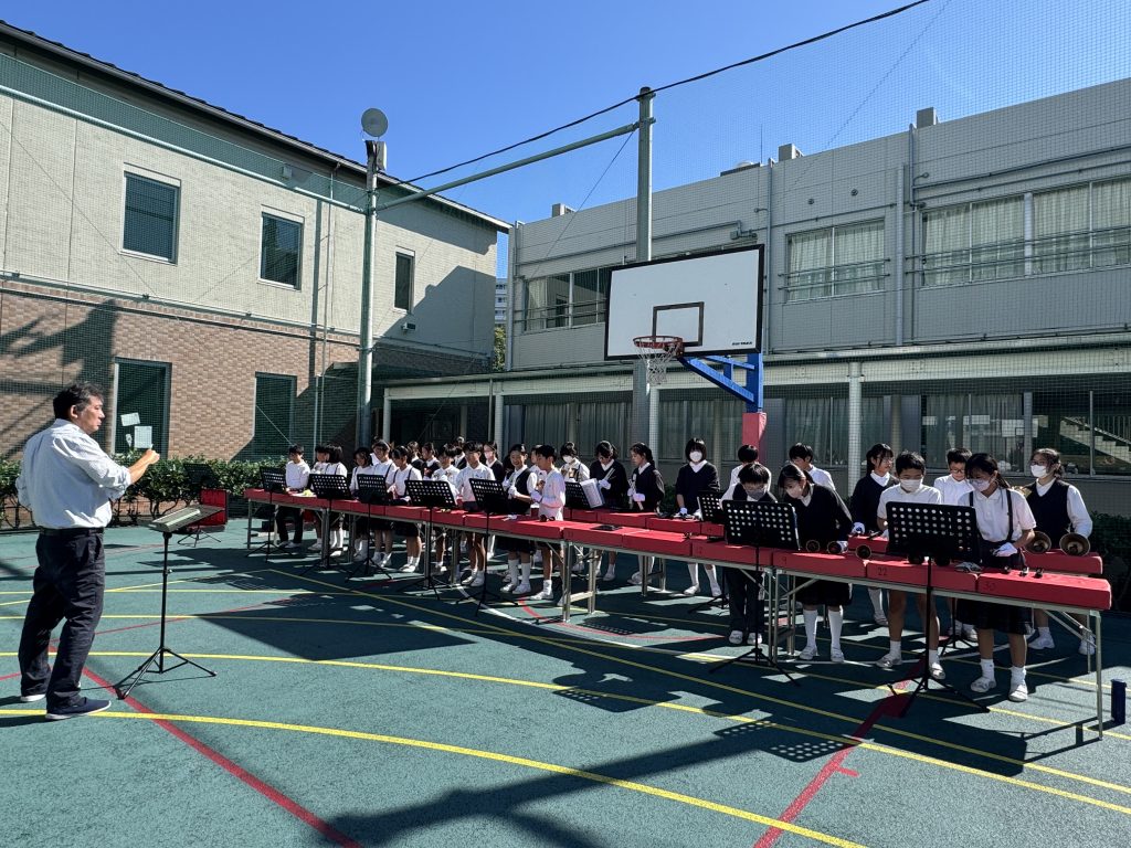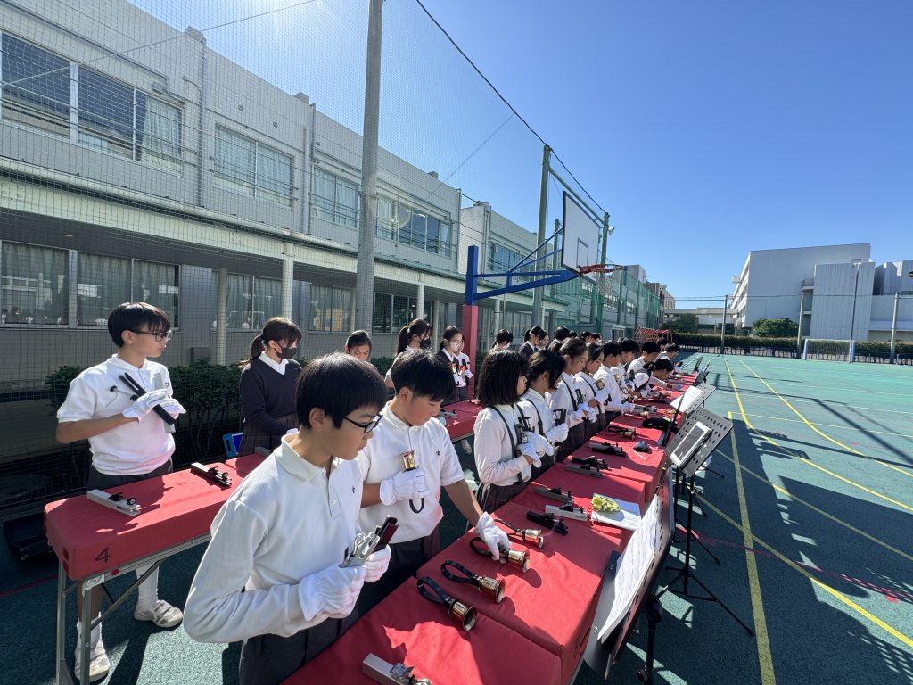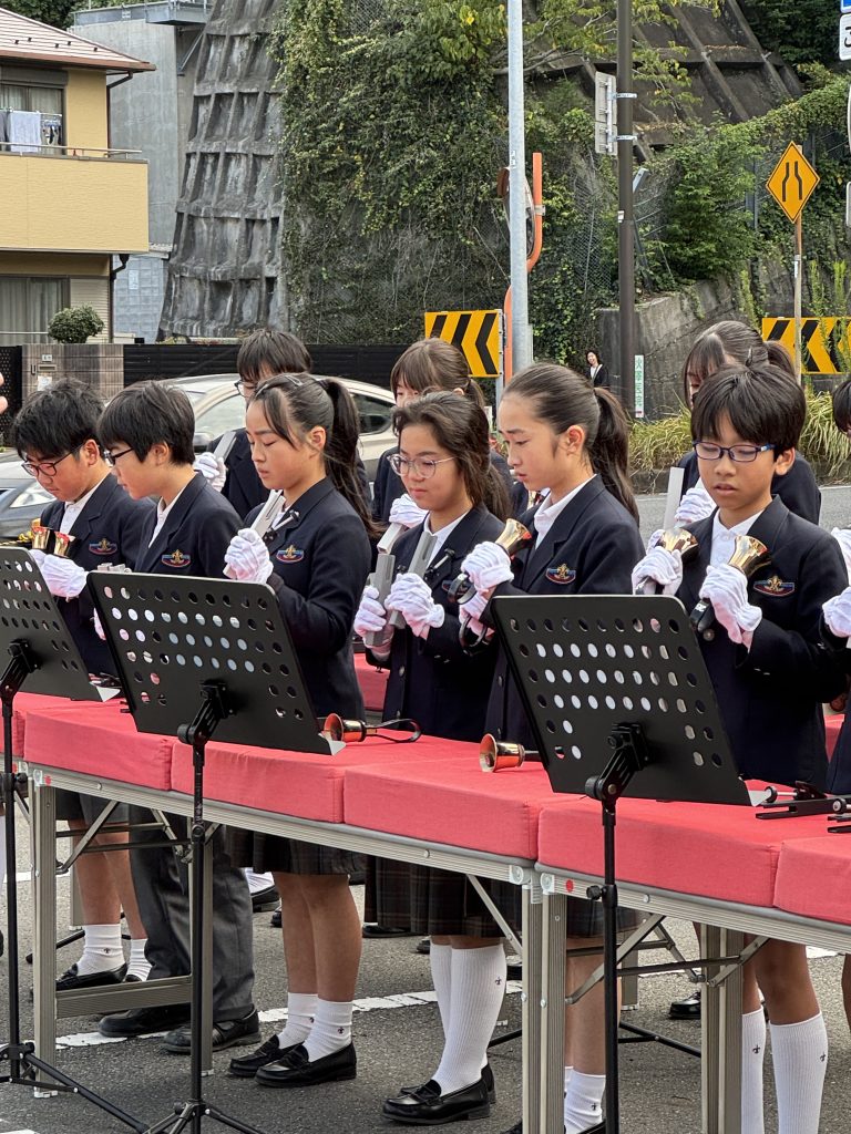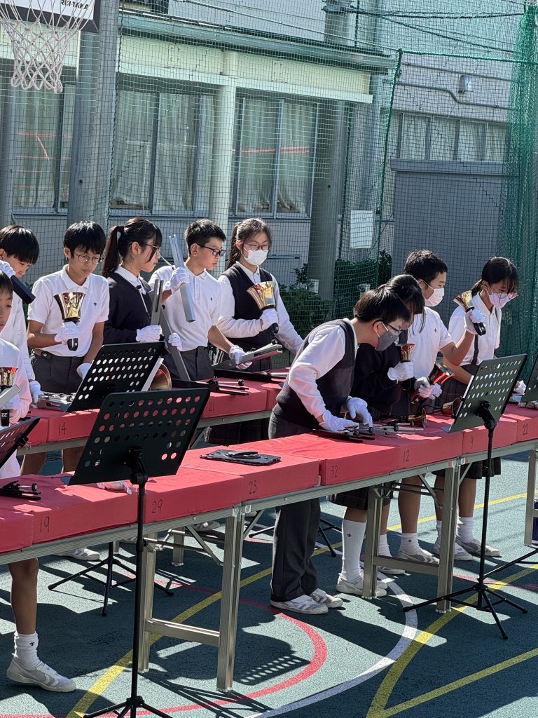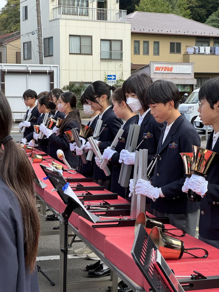 初めての屋外演奏なので、事前に何回かCグラウンドで練習を重ねました。風が強い日があれば楽譜が飛ぶ…灼熱の暑さの日があればまぶしすぎるほど反射して楽譜が見えず、手袋をして立っていることも辛いくらい暑い……それでも様々な課題対策をしながら本番に臨みました。場所は国道16号の真横と言うこともあり、車が行き交う音は防げませんが、演奏の時になるとそれまで吹いていた風は止み、雲から陽がさし、会場はベルが奏でる音で包まれました。