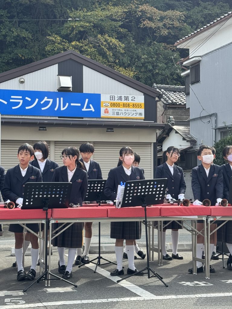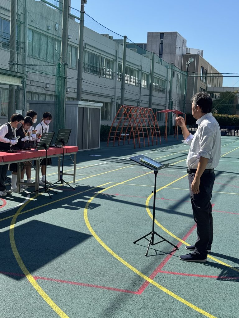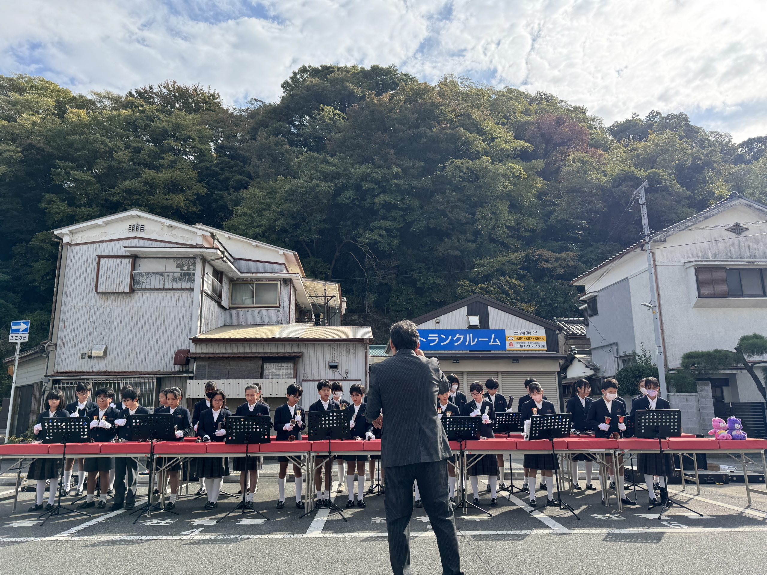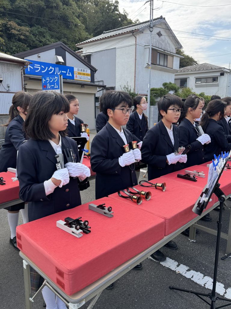 初めての屋外演奏なので、事前に何回かCグラウンドで練習を重ねました。風が強い日があれば楽譜が飛ぶ…灼熱の暑さの日があればまぶしすぎるほど反射して楽譜が見えず、手袋をして立っていることも辛いくらい暑い……それでも様々な課題対策をしながら本番に臨みました。場所は国道16号の真横と言うこともあり、車が行き交う音は防げませんが、演奏の時になるとそれまで吹いていた風は止み、雲から陽がさし、会場はベルが奏でる音で包まれました。