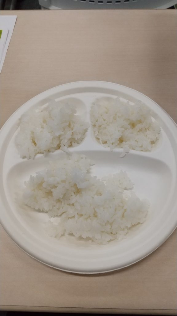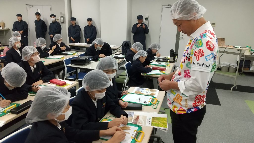 この校外学習のために、秋田県からJA全農あきたの方が4名来られ、稲のことや米作りの作業などとてもくわしく説明していただきました。そこへ秋田県産の「あきたこまち」「サキホコレ」「ひとめぼれ」の3品種の炊き立てのご飯が登場。子どもたちはいつになく真剣に、お米を食べ比べていました。「つやつやしている!」「あま~い!」「モチモチしている!」などなど口々に感想を言い合います。人気の高かったのは「サキホコレ」。秋田県の新しい品種だそうです。
