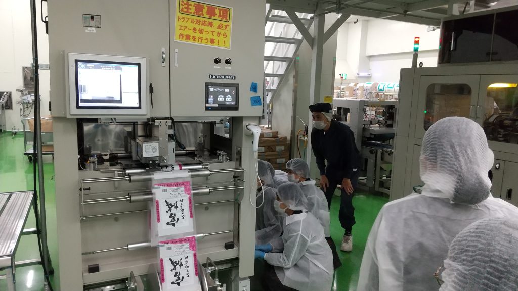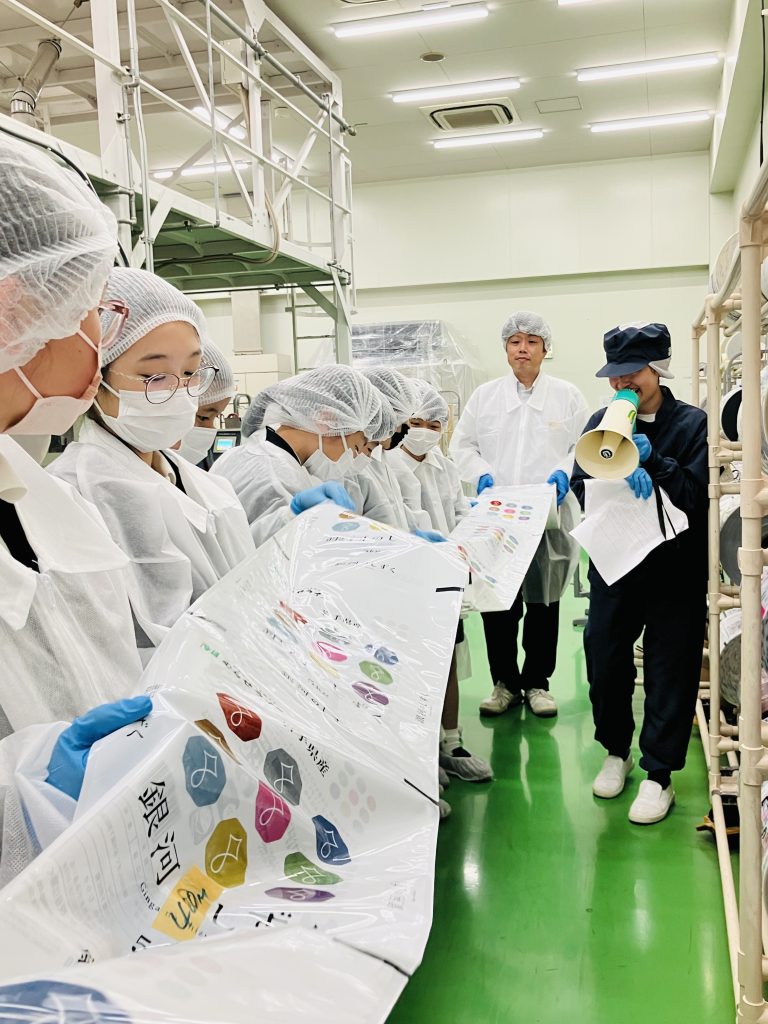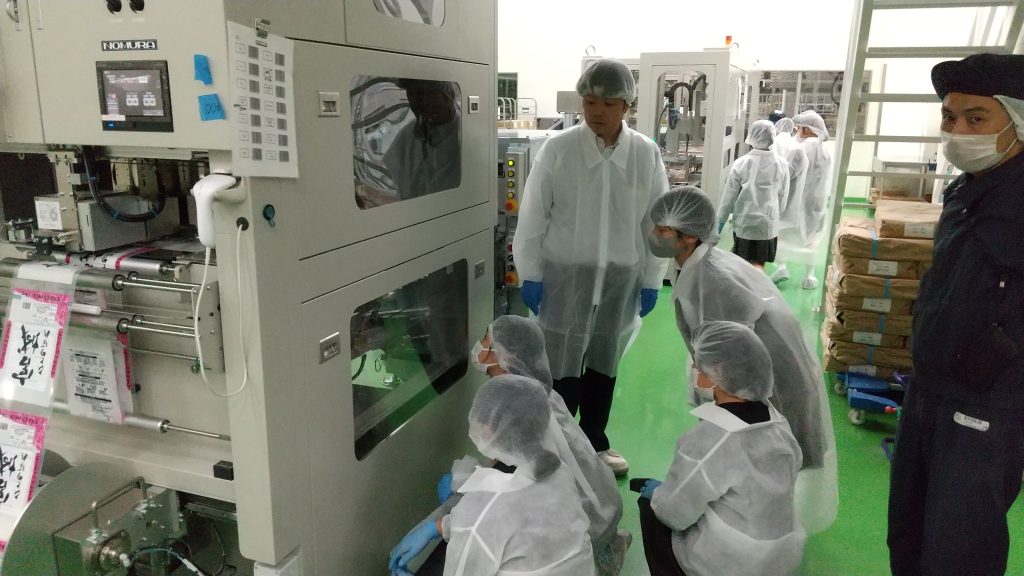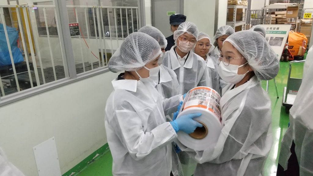 午後は、白衣を着て工場内を見学。一日に200tも精米できる大型の機械の大きさや音にびっくり。また精米されたお米が機械で袋詰めされ、コンベアで流れていく様子に興味津々。たくさんの品種が精米されるようで、何十種類もの袋が用意されていて「これ見たことある!」と目をキラキラさせて見学しました。