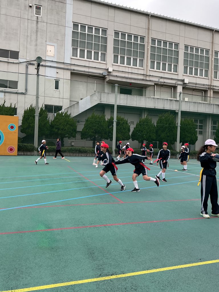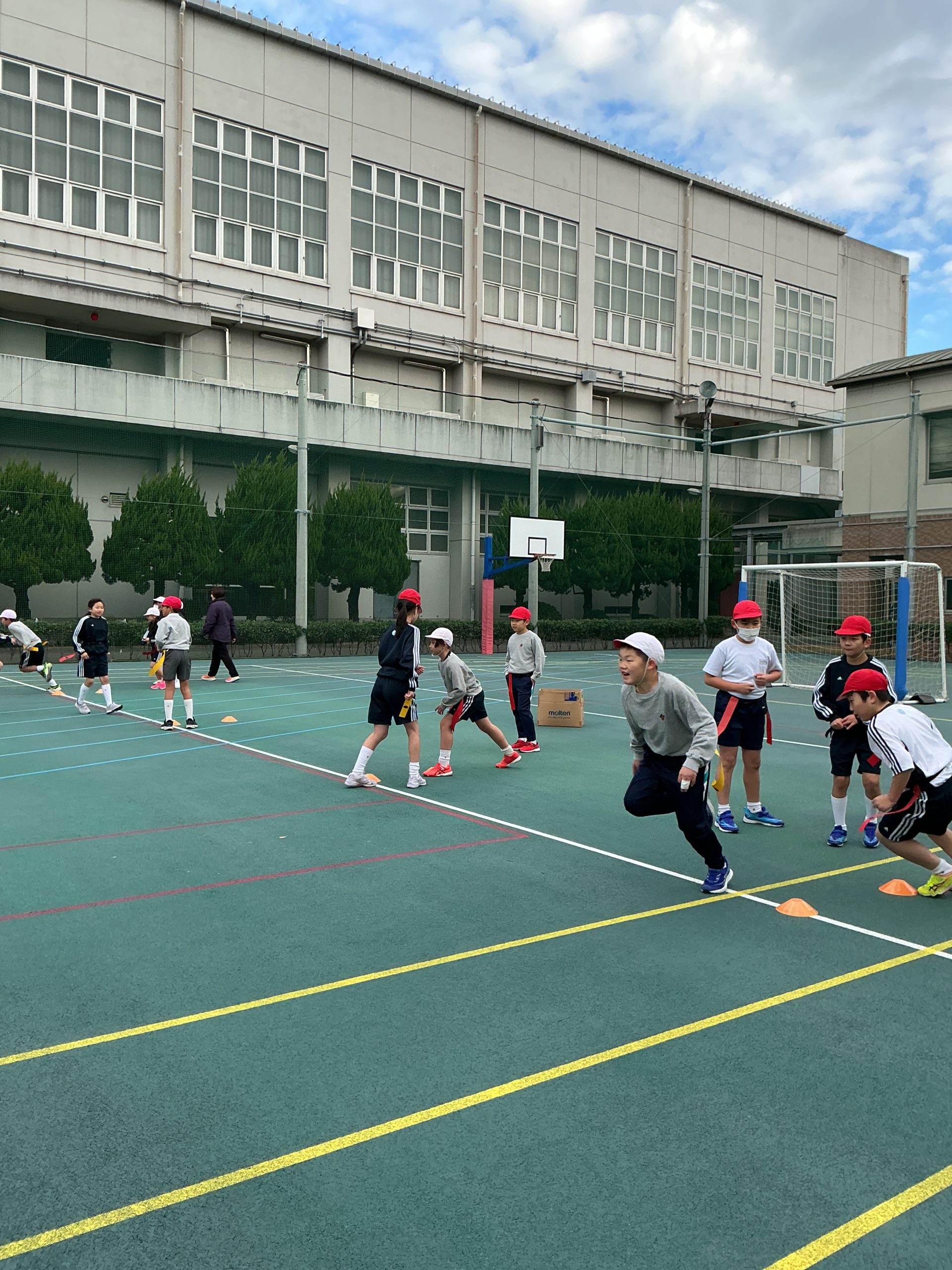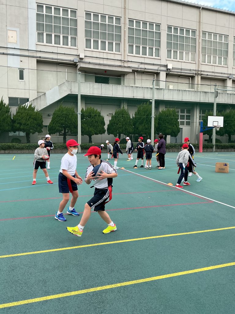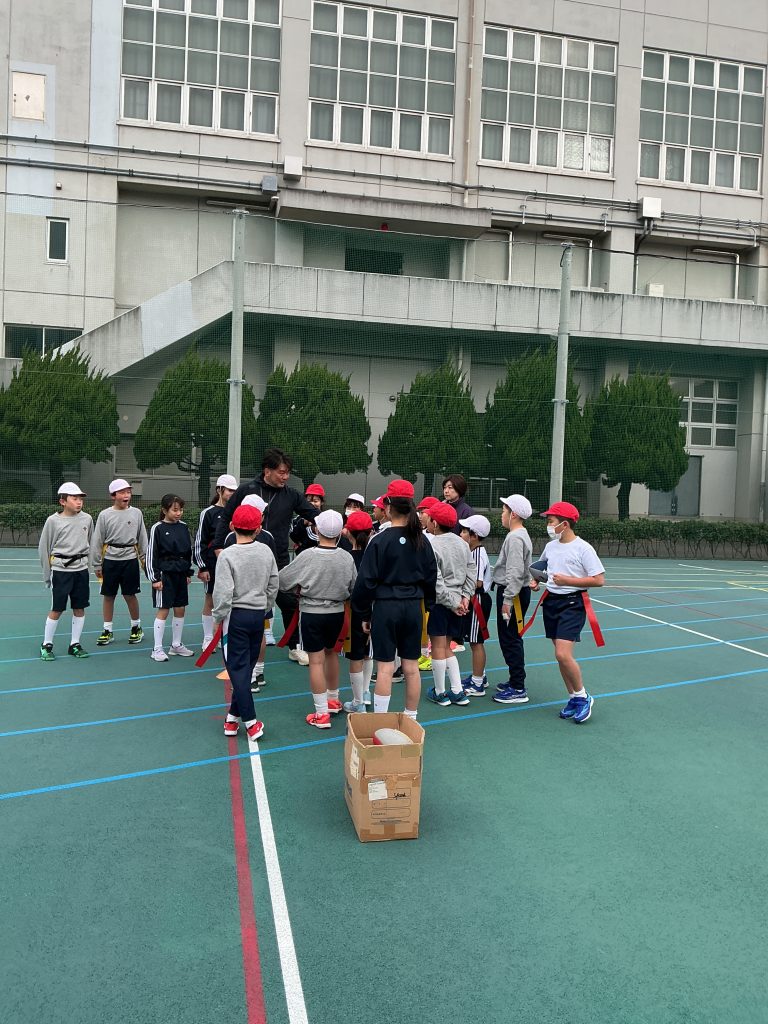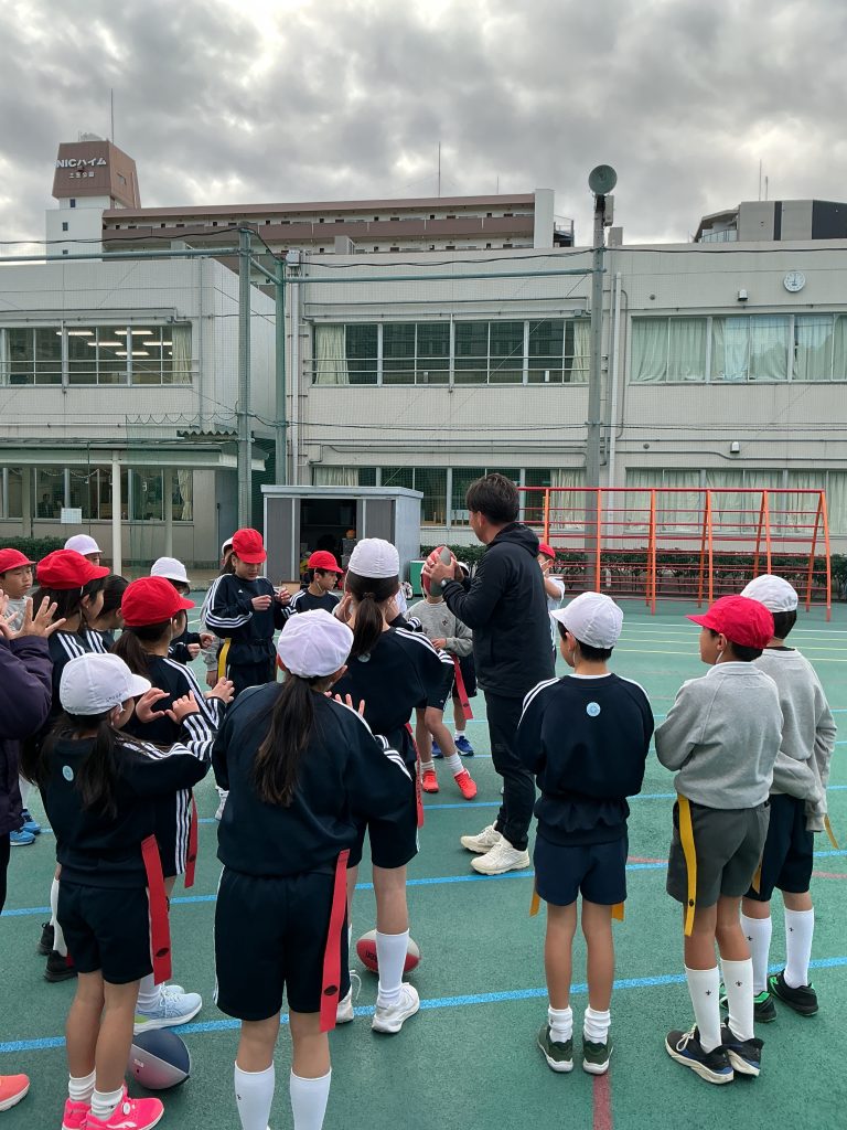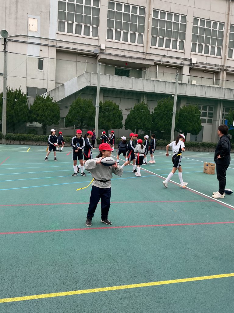 講師の先生を招いて、4.5年生のタグラグビー教室を行いました。