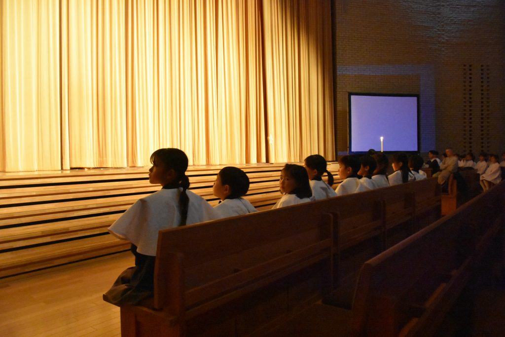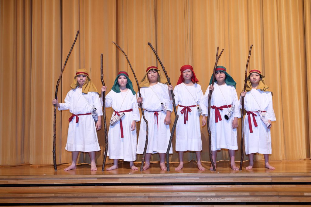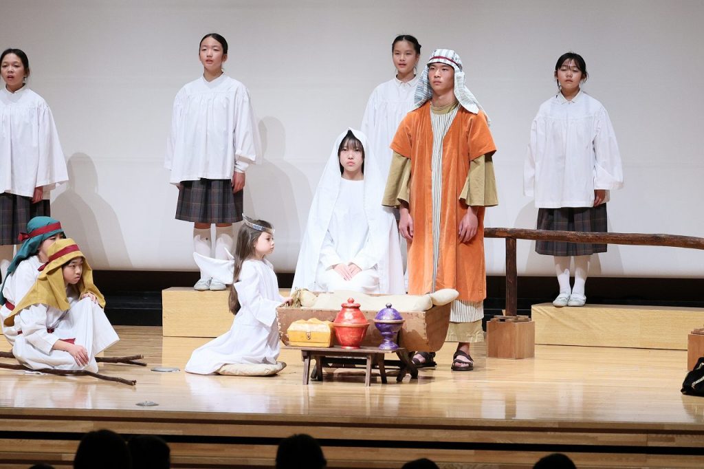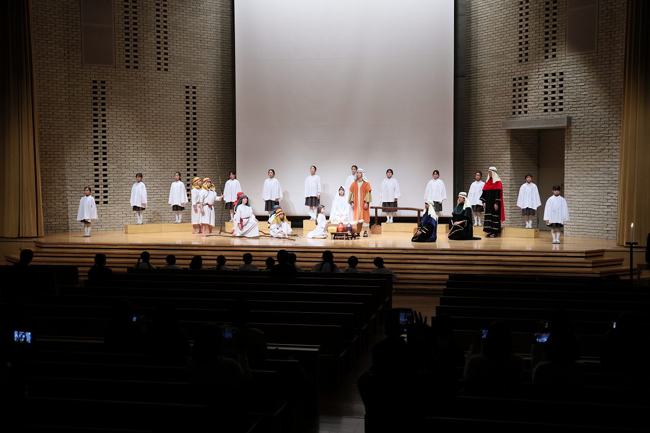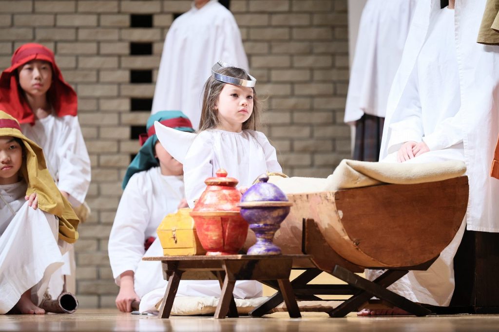小学生、中学生、高校生、教職員がそれぞれの役割を務め、何十年も変わらない横須賀学院が繋いできたページェントです。イエス様の誕生を心からお祝いする気持ちを込め、児童生徒、出席された保護者の賛美歌でチャペルが満たされました。