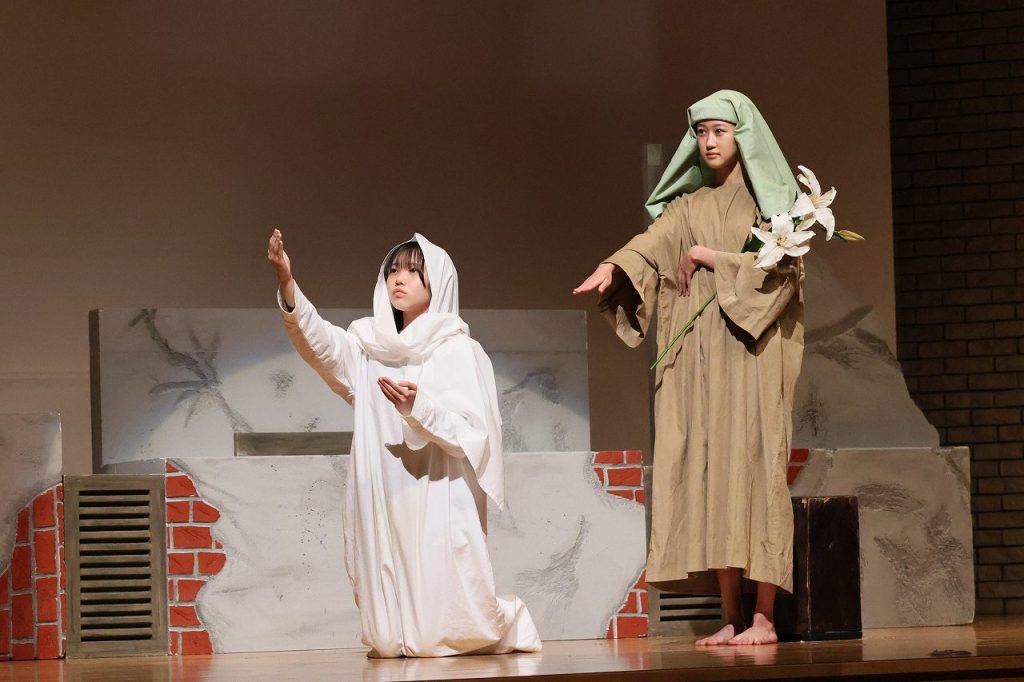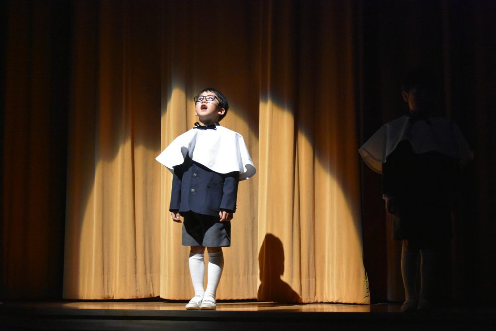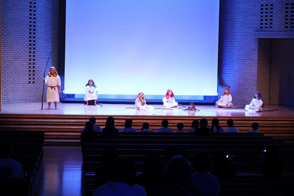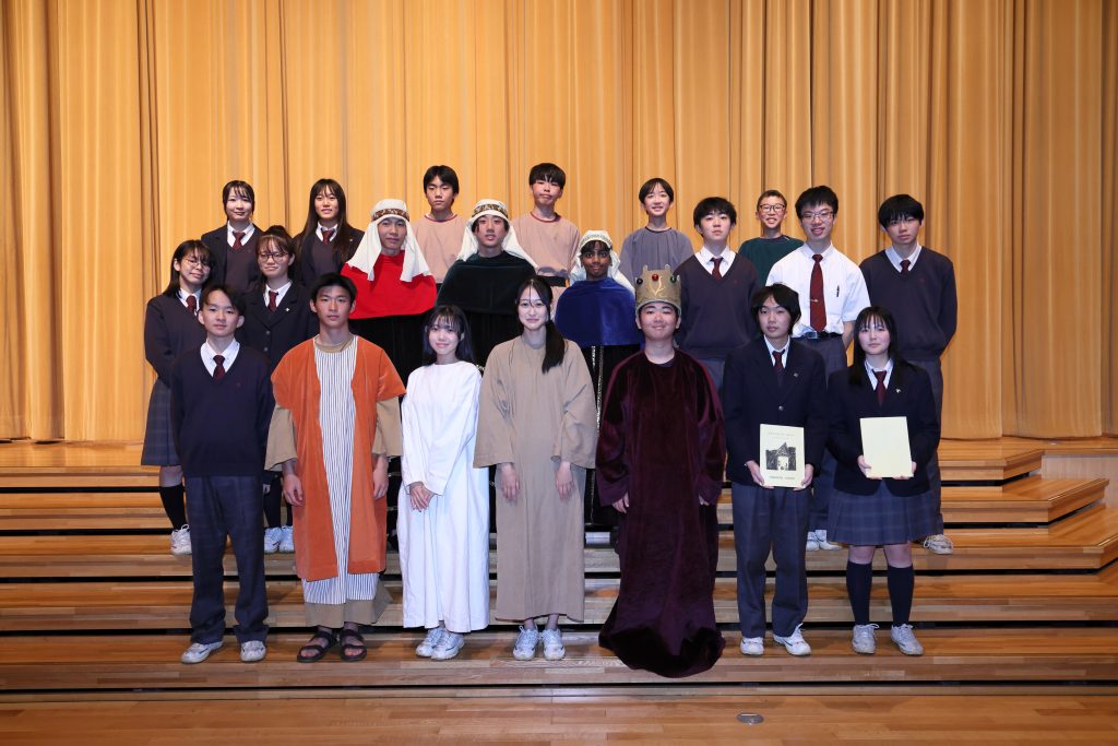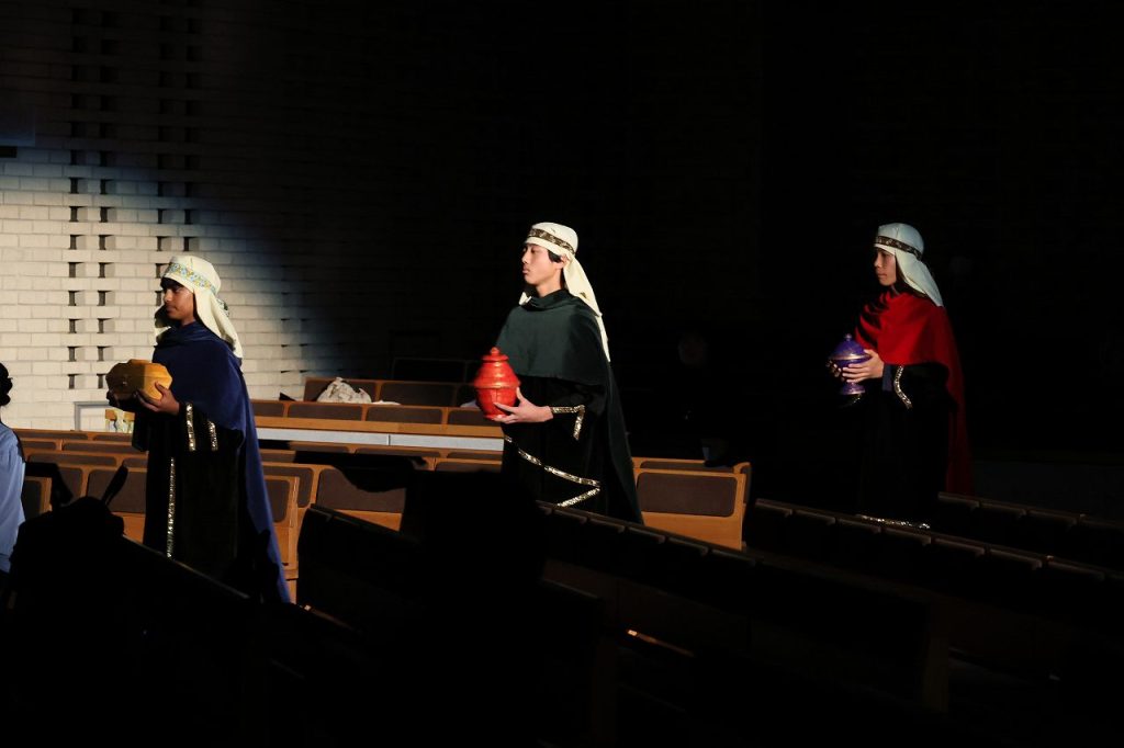小学生、中学生、高校生、教職員がそれぞれの役割を務め、何十年も変わらない横須賀学院が繋いできたページェントです。イエス様の誕生を心からお祝いする気持ちを込め、児童生徒、出席された保護者の賛美歌でチャペルが満たされました。
