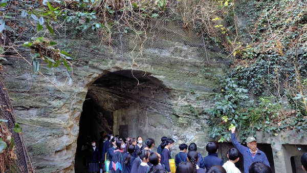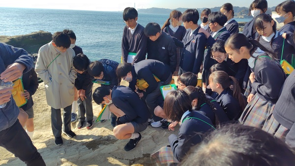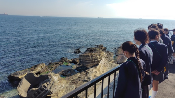 地層の学習の一環として、観音崎自然博物館の専門の方に案内をしていただきながら、観音崎の地層を観察します。