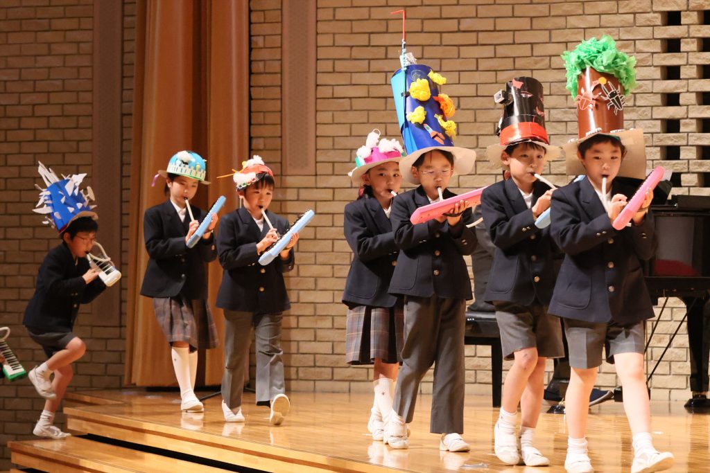 2年生は、図工で作った「帽子」をかぶり、ピアニカでたくさんの音楽を届けてくれました。一人一人が、複雑なメロディーももろともせず、心を一つに響かせたピアニカの音色、パイプオルガンとのコラボレーションに癒されました。