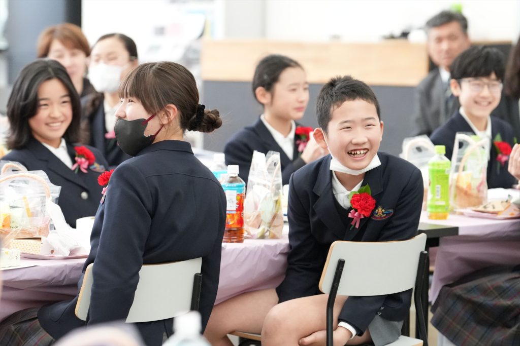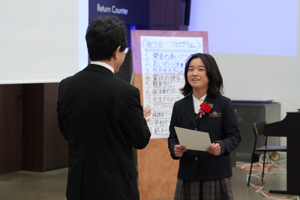 その後の、卒業を祝う会では、卒業生最後のハンドベル演奏、保護者の方の用意してくださったスライドショー、6年間の学校生活を振り返ったスライドショー、教師からの歌のプレゼントがありました。保護者から子どもへ、子どもから保護者へ、のサプライズもあり、あたたかい時間となりました。